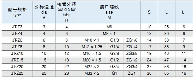*標(biāo)記示例:①:卡套式三通終端管接頭 公稱通徑Ø6MM JT-3T-Z6 M10×1