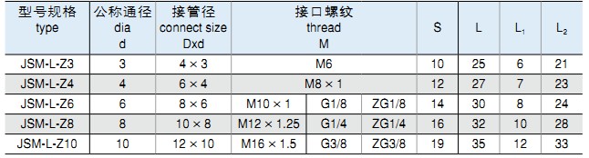 • 標記示例: ①:鎖母式三通終端管接頭 公稱通徑 Ø6MM JSM-3T-Z6 M10×1