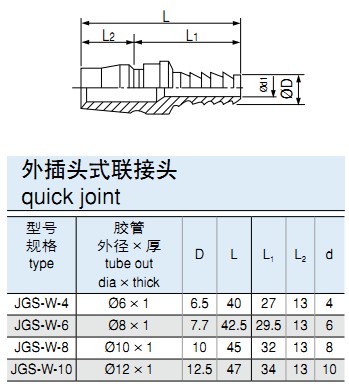安裝及應用最大工作壓力:3.5MPa.工作溫度:-10℃~+100℃型號規格說明,下圖例JGS-W-6A(JGS-K-6B)插入式外螺紋接口。高性能快速接頭,外插式內螺紋接口。外形尺寸
