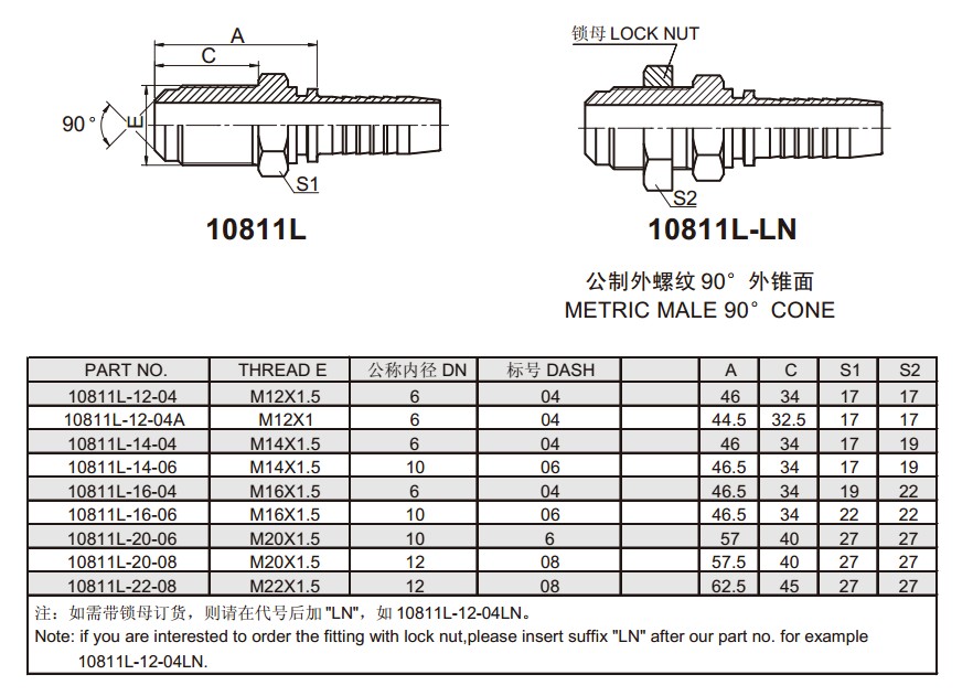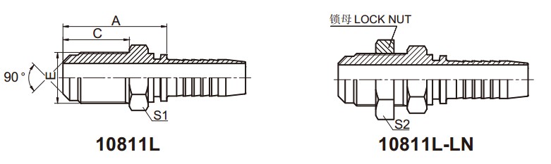10811L 公制外螺紋90°外錐面 扣壓式軟管接頭