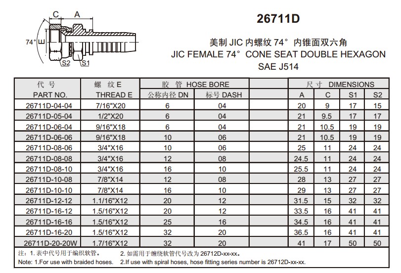 26711D 美制JIC內螺紋74°內錐面雙六角