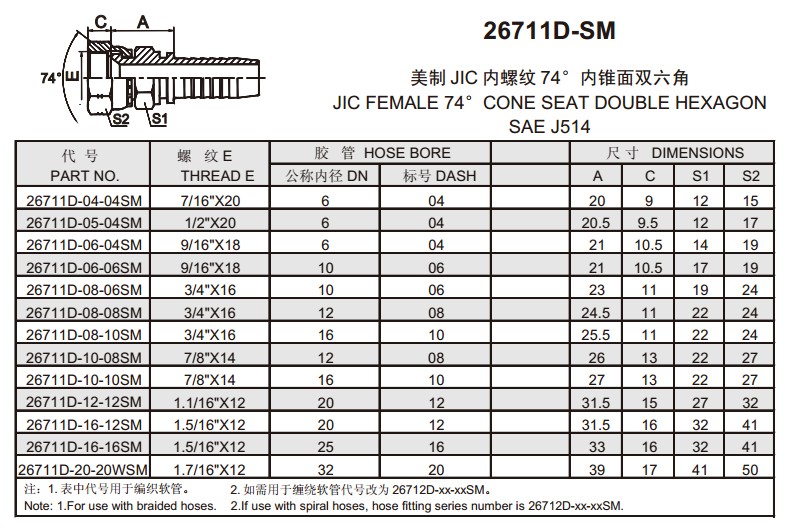 26711D-SM 美制JIC內螺紋74°內錐面雙六角
