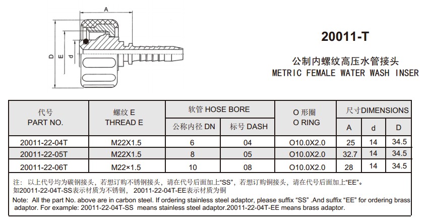 20011-T 公制內螺紋高壓水管接頭