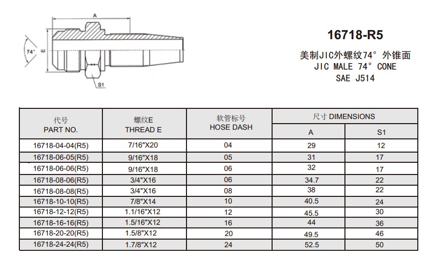 16718-R5 美制JIC外螺紋74°外錐面