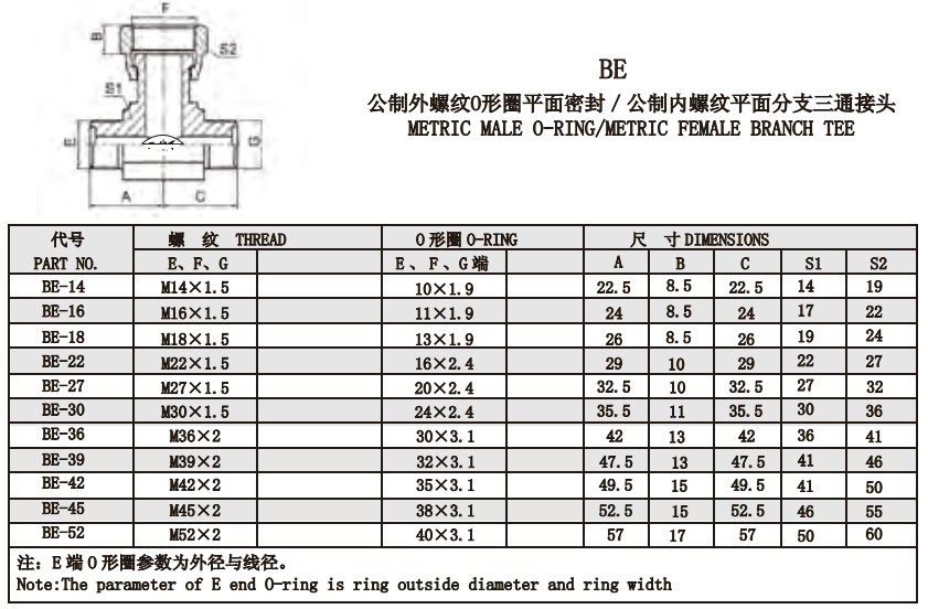 BE 公制外螺紋O形圈平面密封/公制內螺紋平面分支三通接頭