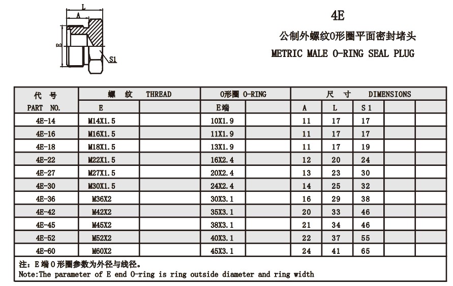 4E 公制外螺紋O形圈平面密封堵頭