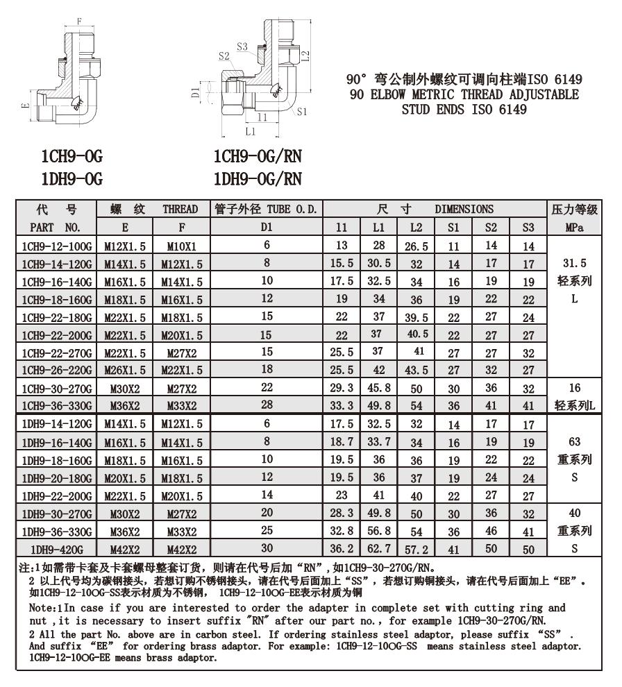 1CH-OG 1DH-OG 90°彎公制外螺紋可調(diào)向柱端ISO 6149
