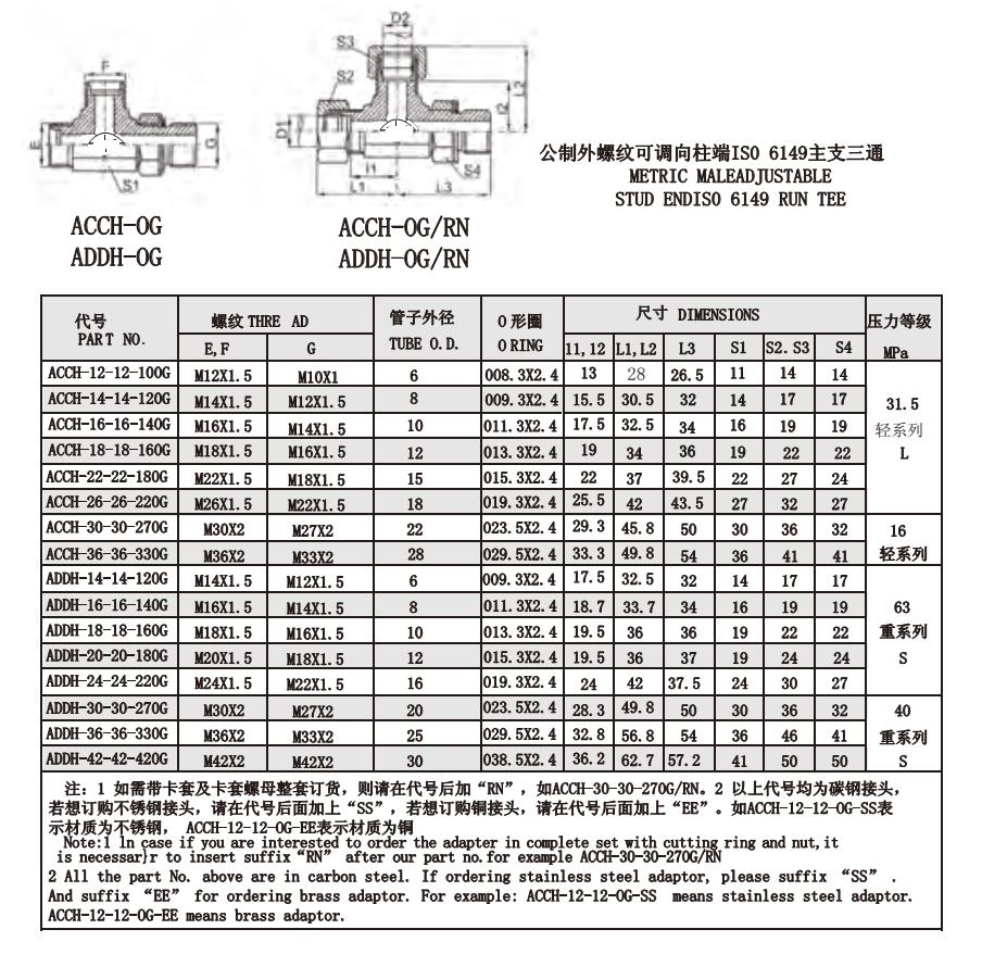 ACCH-OG ADDH-OG 公制外螺紋可調向柱端IS0 6149主支三通