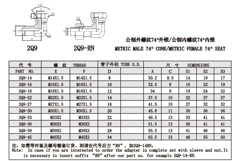 2Q9 2Q9-RN 公制外螺紋74°外錐/公制內(nèi)螺紋74°內(nèi)錐