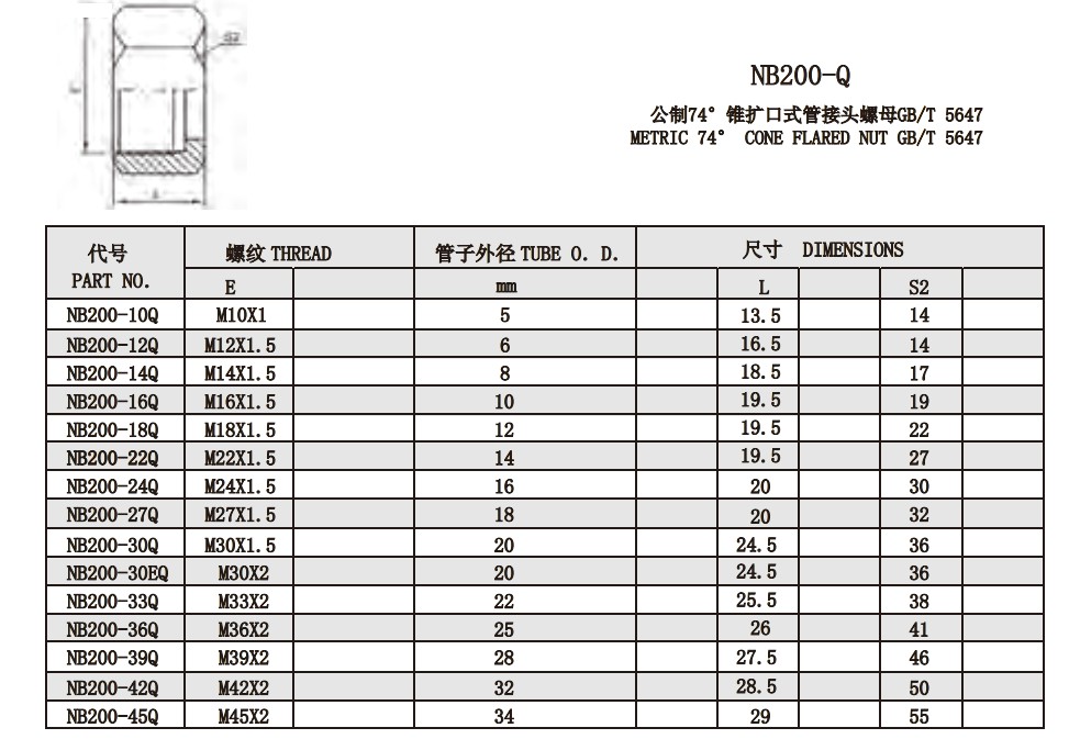 NB200-Q 公制74°錐擴口式管接頭螺母GB/T 5647