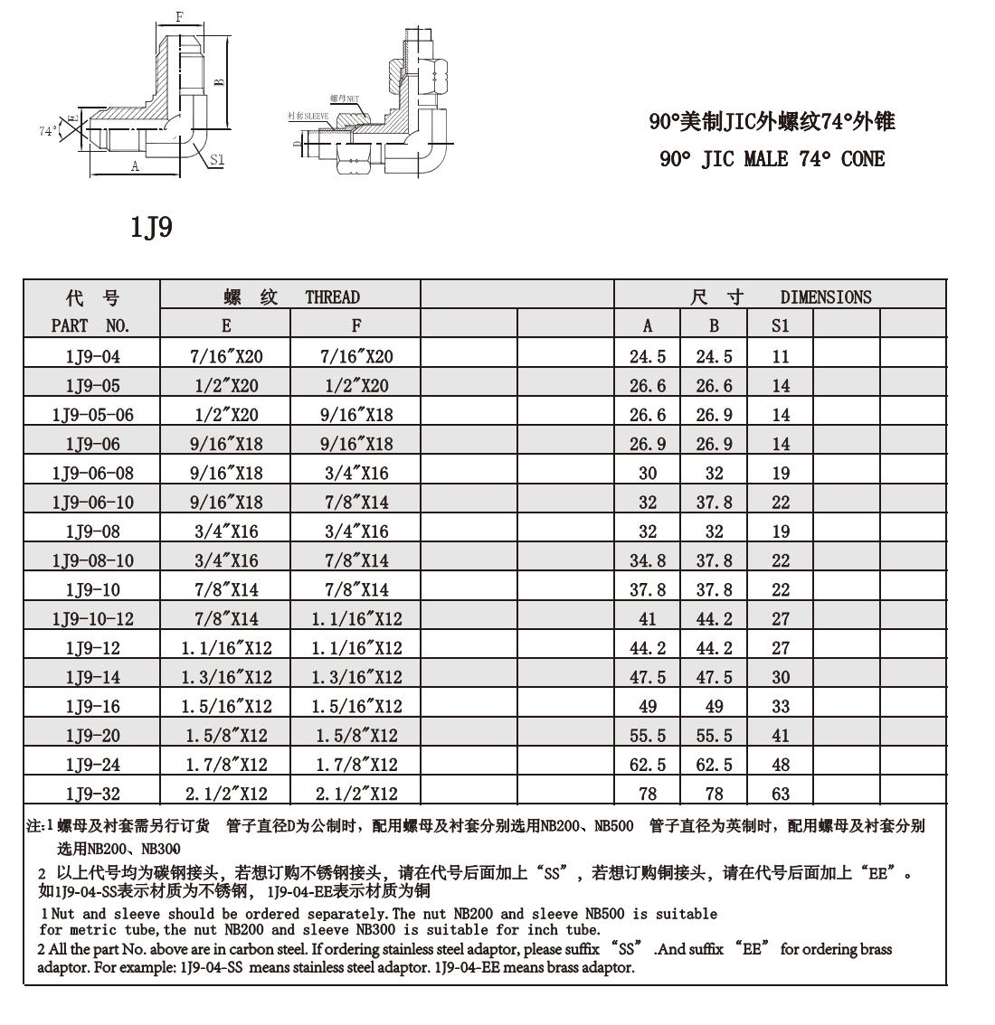 1J9 90°美制JIC外螺紋74°外錐