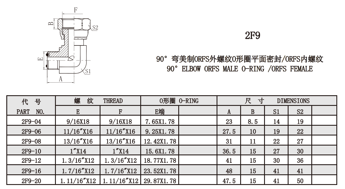 2F9 90°彎美制ORFS外螺紋O形圈平面密封/ORFS內螺紋