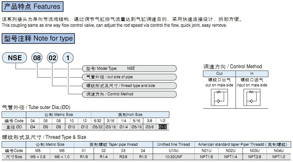 氣動接頭 快插式 NSE系列,為單向節流閥結構,通過調節氣缸排氣流量達到氣缸調速目的,采用快速連接設計,拆卸方便。