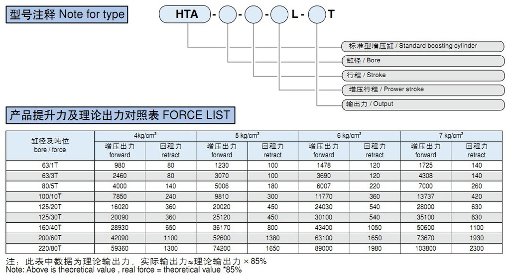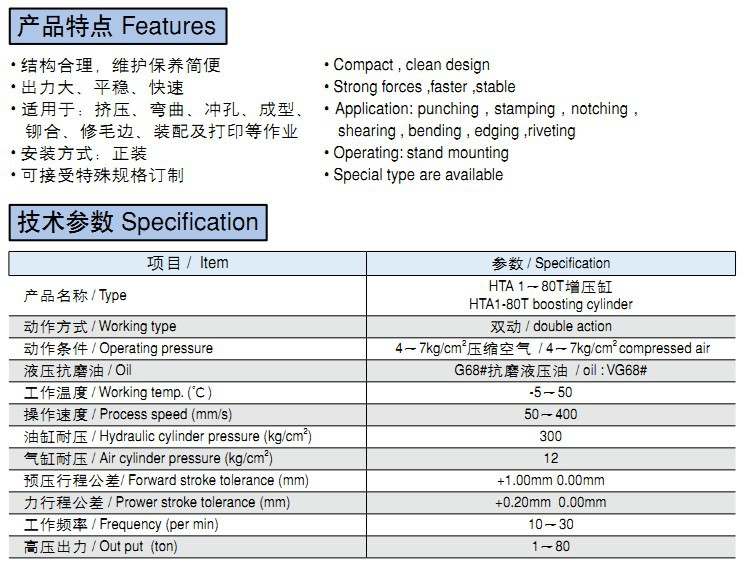 技術參數 Specification項目 / Item 參數 / Specification產品名稱 / TypeHTA 1~80T增壓缸HTA1-80T boosting cylinder動作方式