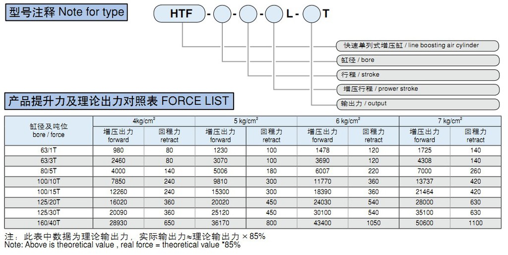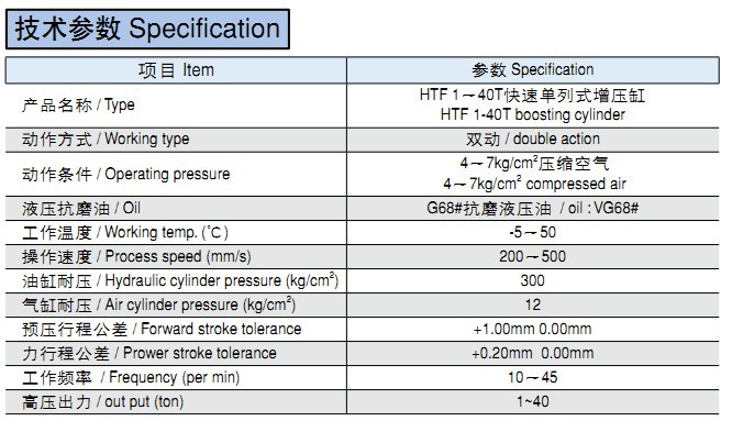 技術參數 Specification項目 Item 參數 Specification產品名稱 / TypeHTF 1~40T快速單列式增壓缸HTF 1-40T boosting cylinder&l
