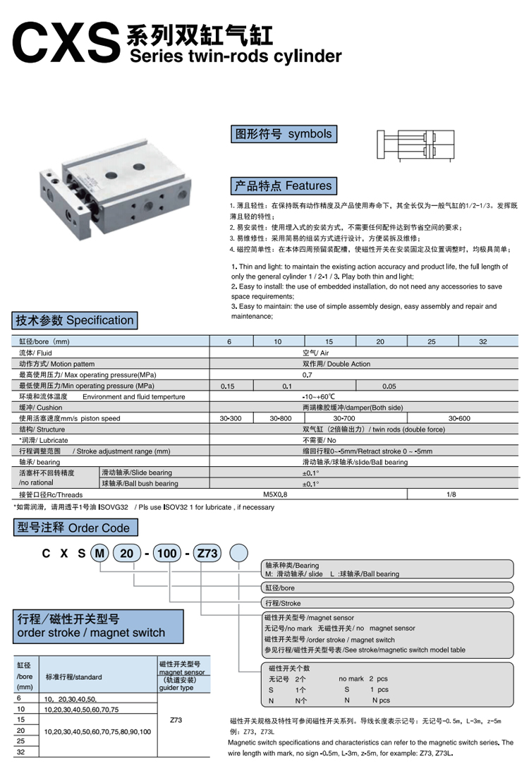 雙缸氣缸CXS系列,薄型雙桿雙氣缸結構,不搖轉精度高及2倍出力,側面負荷抵抗力強。非標氣缸定制可按圖非標加工