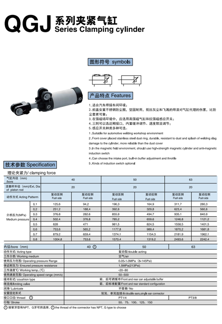 QGJ系列夾緊氣缸是根據工夾具自動化夾緊需要而設計的。具有結構緊湊、體積小、安裝維修方便、工作可靠、運動平穩等特點。廣泛適用于各種工裝夾具的氣動夾緊機構上,是汽車制造等行業自動化生產線上的理想氣動元件。
