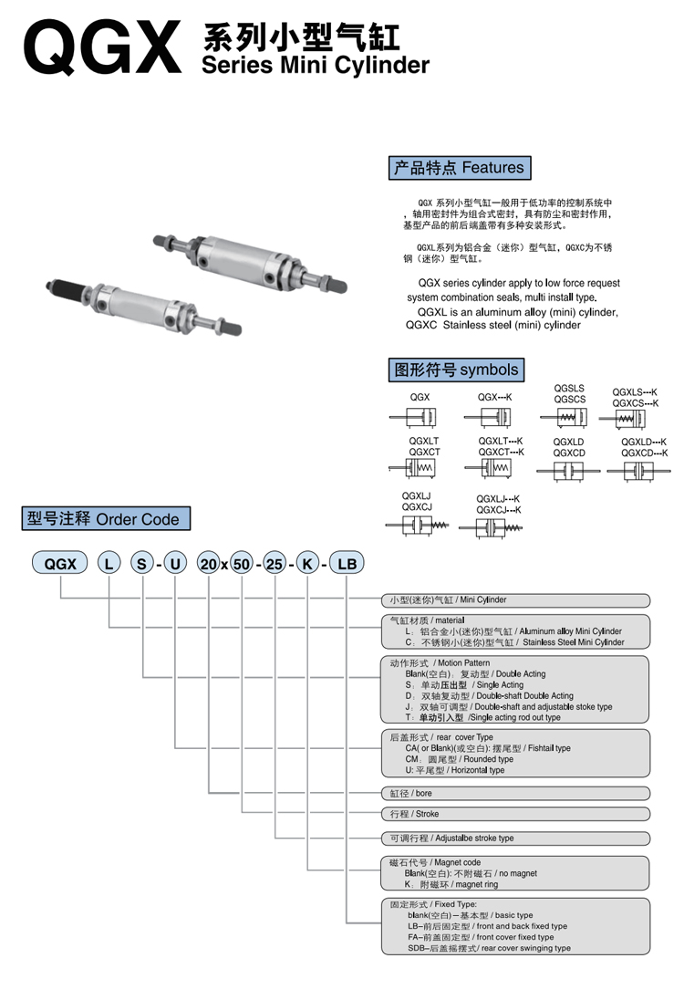 QGXL系列小型氣缸,采用鋁材質缸體,輕便靈活,動作可靠。 工作壓力:1-9.0MPa,保證耐壓力:13.5,緩沖形式:緩沖墊片,環境溫度:0-70℃,活塞運動速度:50-800mm/s,工作介質:干燥潔凈含油霧的壓縮空氣缸