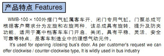 WMB-100×100外擺門氣缸屬客車開、閉門專用氣缸。門泵總成可根據客戶需求分為左旋和右旋兩種,該總成具有旋轉、提升及防夾功能,適用于高中檔客車車門開啟、關閉。具有平穩、靈活、安全可靠等特點,是客車制造業中的理想氣動元件。