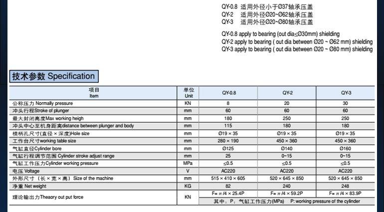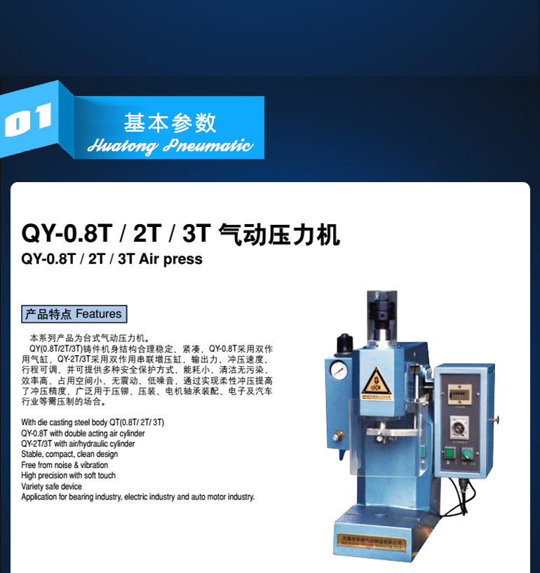 QY(0.8T/2T/3T)鑄件機身結構合理穩定、緊湊,QY-0.8T采用雙作用氣缸,QY-2T/3T采用雙作用串聯增壓缸,輸出力、沖壓速度、行程可調,并可提供多種安全保護方式,能耗小,清潔無污染,效率高,占用空間小,無震動、低噪音,通過實現柔性沖壓提高了沖壓精度,廣泛用于壓鉚、壓裝、電機軸承裝配、電子及汽車行業等需壓制的場合。