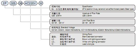 2P系列 二位二通電磁閥 產品特點 采用直動式、快速反應,可多用途使用,高效率,長壽命,優良的防水性能。 圖形符號:型號注釋:技術參數: 型 號:2P025-06 2P025-08