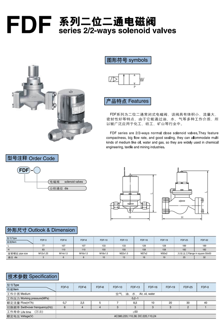 FDF系列 二位二通電磁閥為二位二通常閉式電磁閥,該閥具有體積小、流量大,密封性好等特點,由于它能通過油、水、氣等多種工作介質,所以被廣泛應用于化工、紡工、礦山等行業中。型號FDF-3 FDF-6 FDF-8 FDF-10 FDF-13 FDF-16 FDF-19