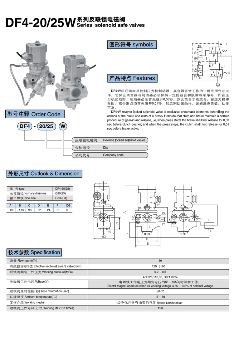 DF4-W系列 反聯鎖電磁閥 產品特點 DF4-W反聯鎖閥是控制壓力機制動器、離合器正常工作的一種專用氣動元件。它保證離合器與制動器必須保持一定的結合和脫霸載順序號,即在壓力機起動時,制動器必須首先脫開0.03秒。然合離合才能結合;在壓力機停車時,離合